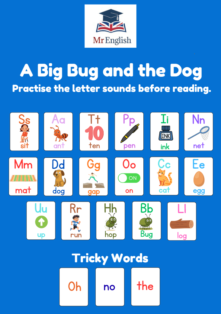 Help your child learn to read with A Big Bug and the Dog! This fun and easy phonics book focuses on CVC words from Phase 2 phonics, featuring short vowel sounds, simple sentences, and adorable illustrations. Perfect for beginner readers learning blending, decoding, and early reading skills.