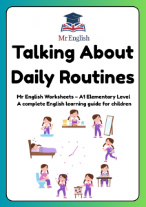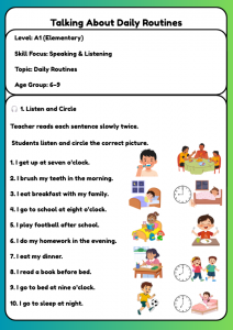 Fun A1 worksheet for ages 6–9 to practise daily routines through listening, matching, and speaking tasks. Perfect for Cambridge A1 Movers English learners.