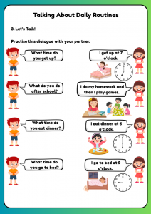 The A1 Daily Routines Speaking & Listening Worksheet is a fun and engaging resource designed specifically for kids aged 6–9. Children will enjoy this activity as it encourages them to practice speaking and listening skills in a playful way. By integrating routine activities into their learning, kids can relate more closely to the material, making the experience enjoyable and interactive. This approach fosters confidence in communication, sparking interest and enthusiasm in their daily learning journey.