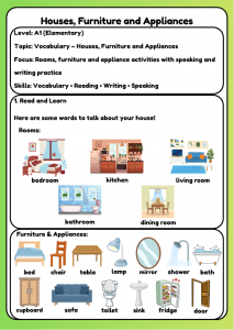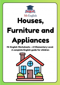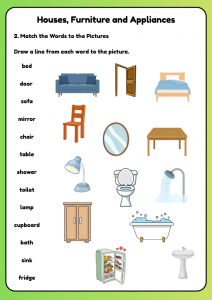 Fun A1 worksheet for ages 6–9 to learn house, furniture, and appliance vocabulary. Practise with matching, writing, and speaking activities for ESL learners.