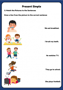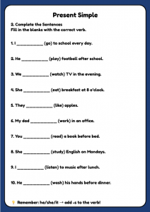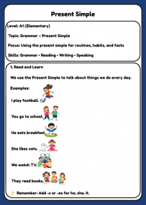 Fun A1 worksheet for ages 6–9 to learn the Present Simple tense. Practise daily routines, verbs, and -s endings with easy grammar, writing, and speaking tasks.