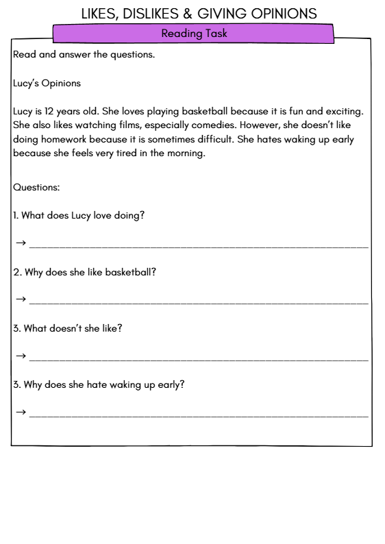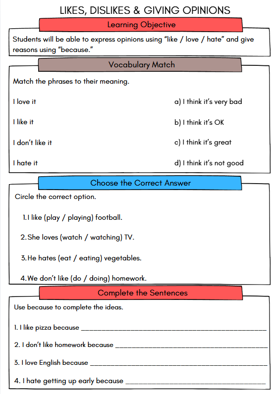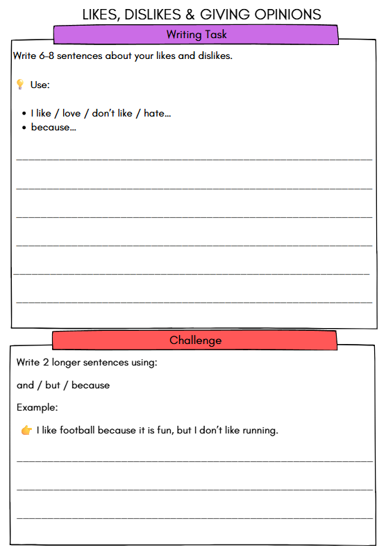 Help learners express opinions confidently with this engaging A2+ English worksheet for ages 9–12. Students practise likes and dislikes using “like,” “love,” “hate,” and “don’t like,” while building sentences with “because,” “and,” and “but.” Includes grammar exercises, reading comprehension, and extended writing tasks — perfect for ESL classrooms and home learning.
