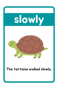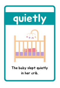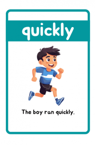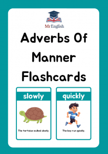 Printable Adverbs of Manner Flashcards for children aged 7–11. These engaging grammar cards include clear examples like “The boy ran quickly” and “The baby slept quietly” to help kids learn adverbs with ease. Perfect for classrooms, homeschooling, and ESL lessons.