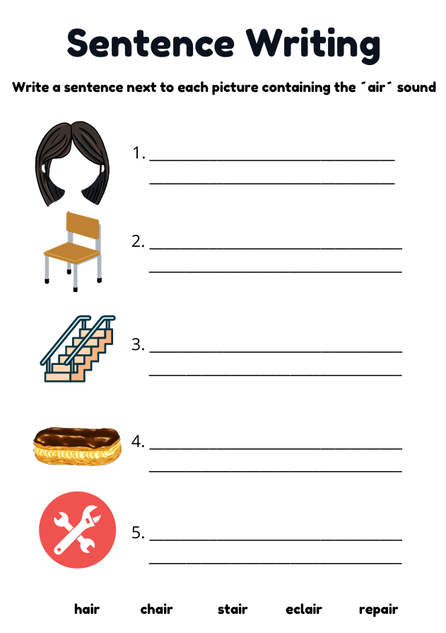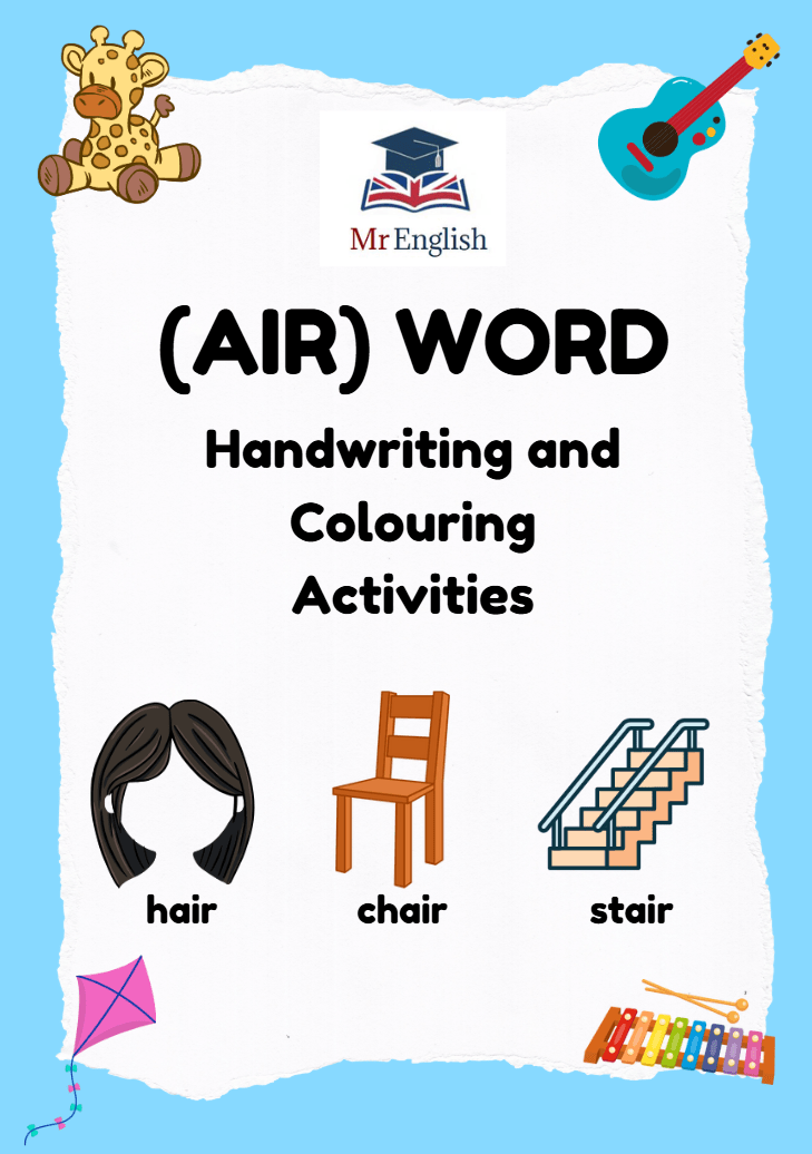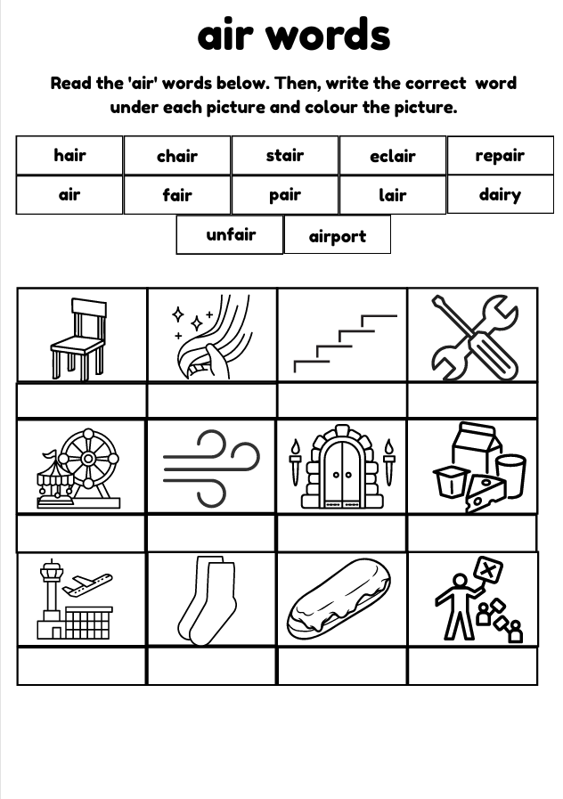 Boost early reading skills with this free AIR words phonics worksheet for children aged 5–7. Includes handwriting practice, colouring activities, and sentence writing with words like chair, hair, stair, repair. Perfect for phonics lessons at home or in the classroom.