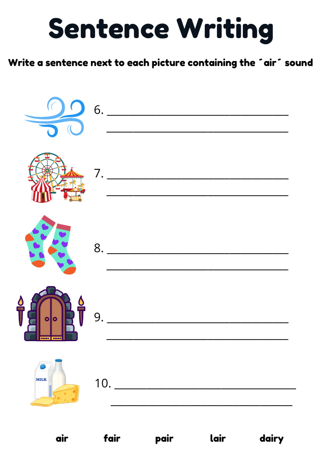 Boost early reading skills with this free AIR words phonics worksheet for children aged 5–7. Includes handwriting practice, colouring activities, and sentence writing with words like chair, hair, stair, repair. Perfect for phonics lessons at home or in the classroom.