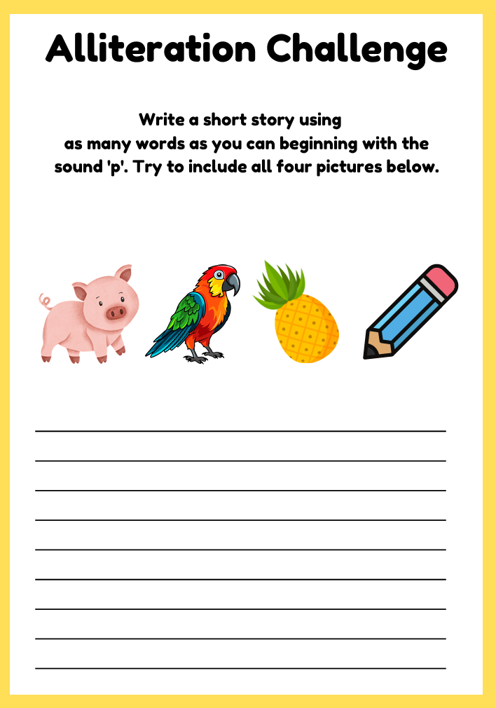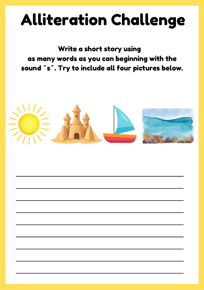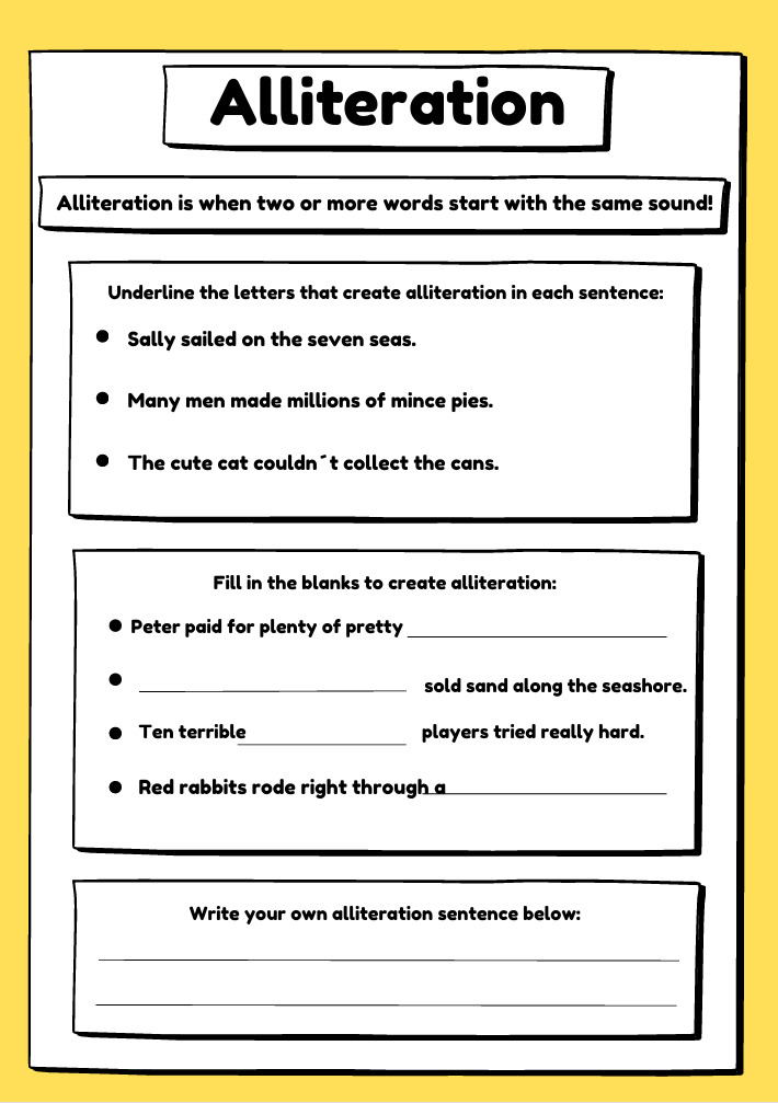 Boost your child’s phonics and creative writing skills with these engaging alliteration worksheets for ages 6–10. Includes fun activities like circling words with the same beginning sound and writing silly sentences or paragraphs using alliteration. Perfect for ESL and primary learners!
