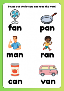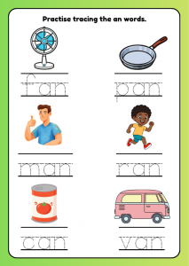 This printable worksheet pack helps pupils practise blending, reading, tracing, and writing CVC words such as fan, man, pan, ran, can, and van.
