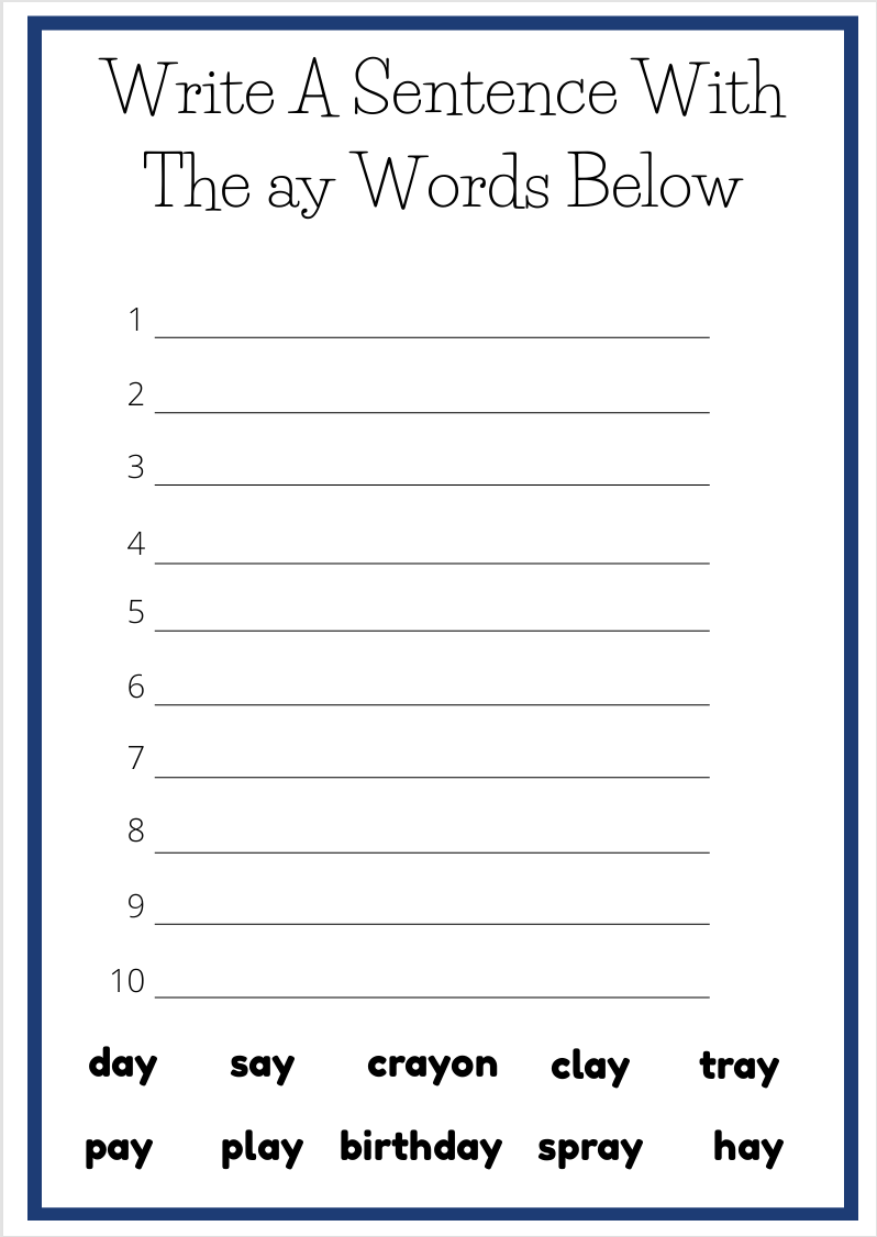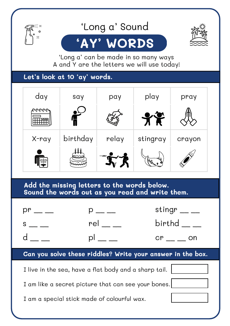 Boost your child’s phonics skills with this AY Words Worksheet for ages 5–8. Includes spelling, picture-word matching, and sentence writing to reinforce the Long A sound. Perfect for classroom or home learning!