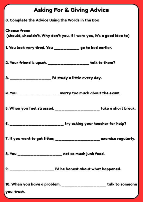 This B1 worksheet for ages 10–12 teaches students how to ask for and give advice through useful phrases, matching tasks, sentence completion, real-life situations, and a listening dialogue. Ideal for building speaking, listening and functional language skills in everyday communication.