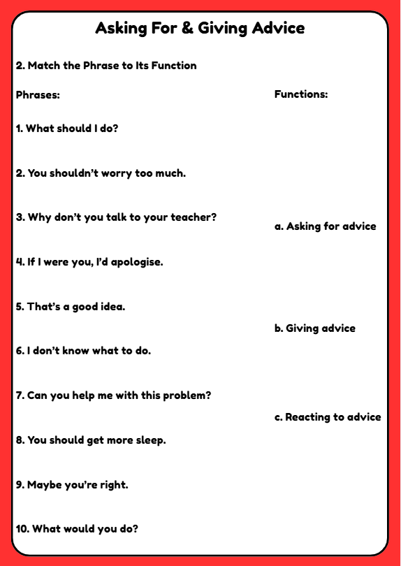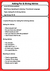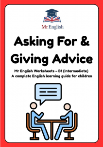 This B1 worksheet for ages 10–12 teaches students how to ask for and give advice through useful phrases, matching tasks, sentence completion, real-life situations, and a listening dialogue. Ideal for building speaking, listening and functional language skills in everyday communication.