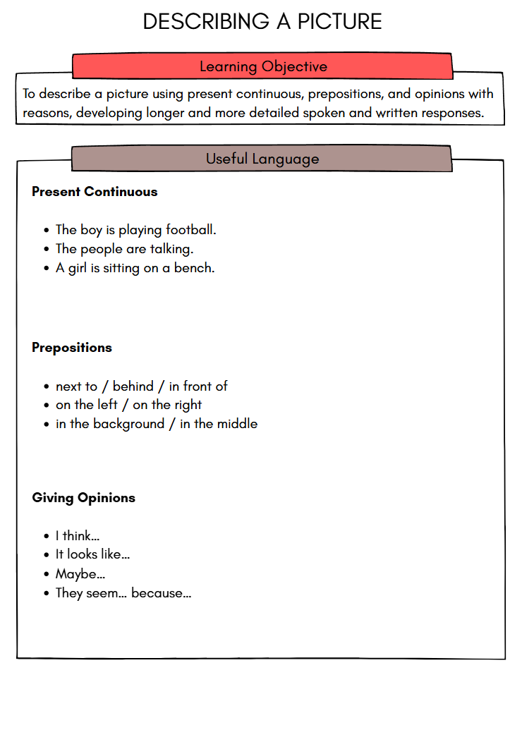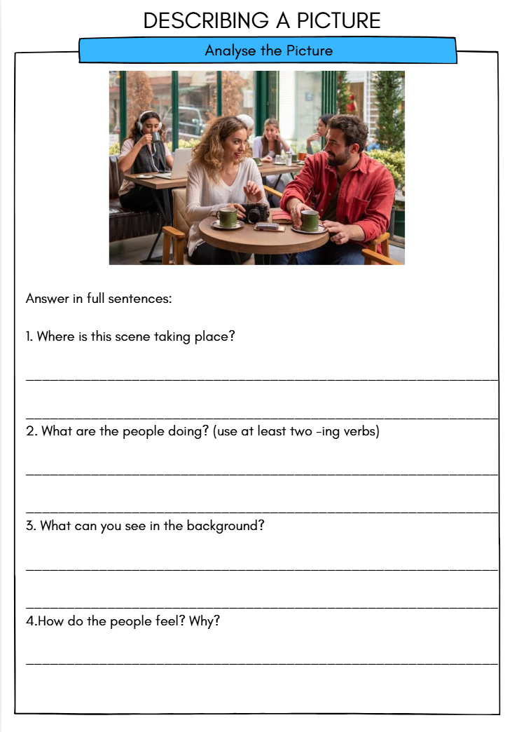 Boost your child’s English speaking and writing skills with this B1 picture description worksheet. Designed to develop confidence and fluency, students practise describing images using present continuous, prepositions, and opinions with reasons. Includes exam-style questions, sentence-building tasks, and a speaking challenge — ideal for ESL learners and Cambridge B1 preparation.