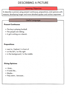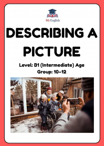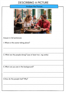 Boost your child’s English speaking and writing skills with this B1 picture description worksheet. Designed to develop confidence and fluency, students practise describing images using present continuous, prepositions, and opinions with reasons. Includes exam-style questions, sentence-building tasks, and a speaking challenge — ideal for ESL learners and Cambridge B1 preparation.
