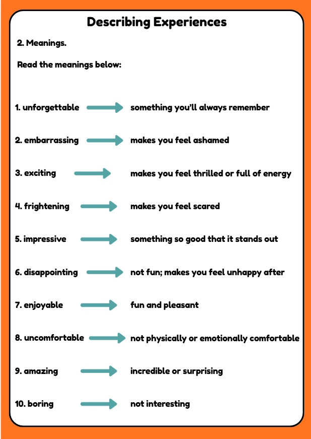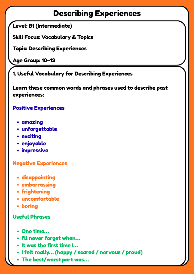 Help B1 learners (ages 10–12) describe past experiences with this vocabulary worksheet. Includes meanings, matching, sentence completion, rewriting tasks, and writing practice.