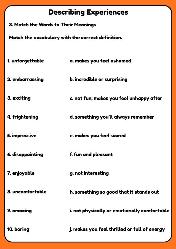 Help B1 learners (ages 10–12) describe past experiences with this vocabulary worksheet. Includes meanings, matching, sentence completion, rewriting tasks, and writing practice.