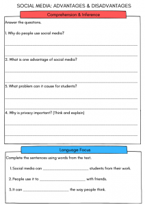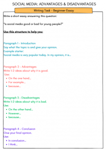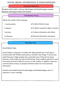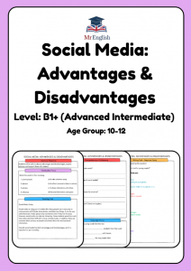 Develop reading, vocabulary, and essay writing skills with this B1+ English worksheet for ages 10–12. Students explore the advantages and disadvantages of social media, complete comprehension tasks, and write a structured beginner essay using clear paragraph guidance — perfect for ESL learners and exam preparation.