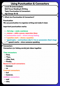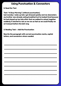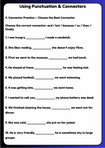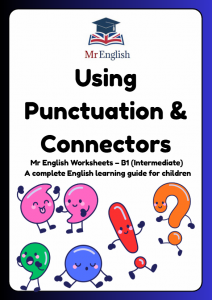 Improve reading and writing skills with this B1 worksheet on punctuation and connectors for ages 10–12. Students practise adding punctuation, choosing the correct connectors, joining sentences, and writing clear paragraphs—perfect for building accuracy, coherence, and confidence in written English.