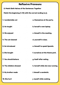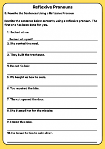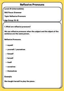 Improve B1 students’ grammar skills with this reflexive pronouns worksheet for ages 10–12. Includes matching, rewriting, error correction, and writing practice.