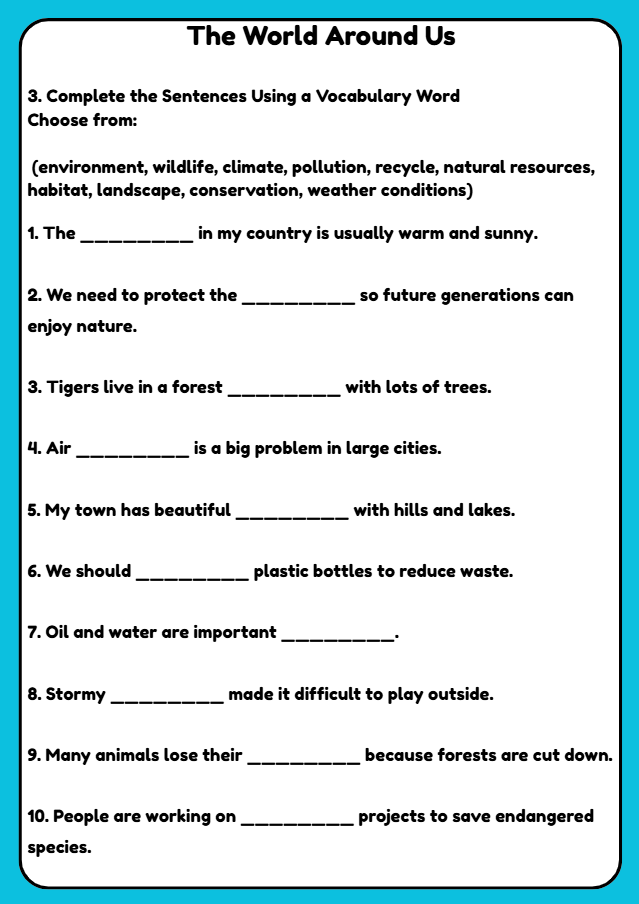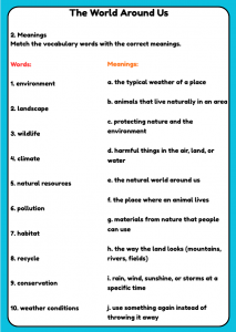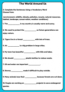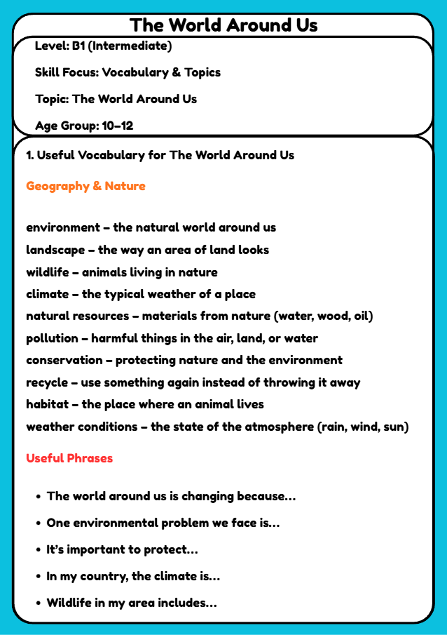 Help B1 learners (ages 10–12) build vocabulary about the environment, nature, climate, and the world around them. This worksheet includes matching meanings, sentence completion, and writing tasks—perfect for improving topic vocabulary, speaking, and writing fluency.