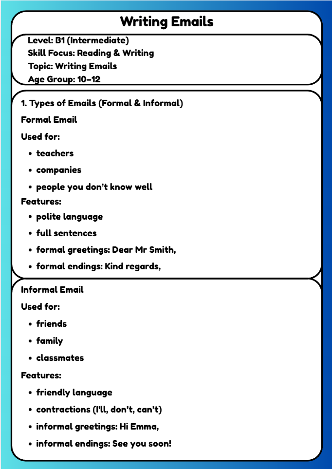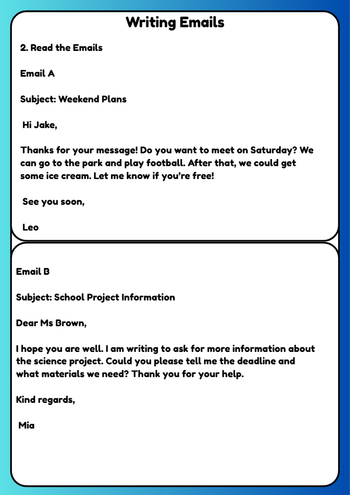 Help B1 learners (ages 10–12) master formal and informal email writing with this worksheet. Includes model emails, gist and detail questions, formal/informal phrase sorting, and guided writing tasks—perfect for building confidence in real-world communication skills.