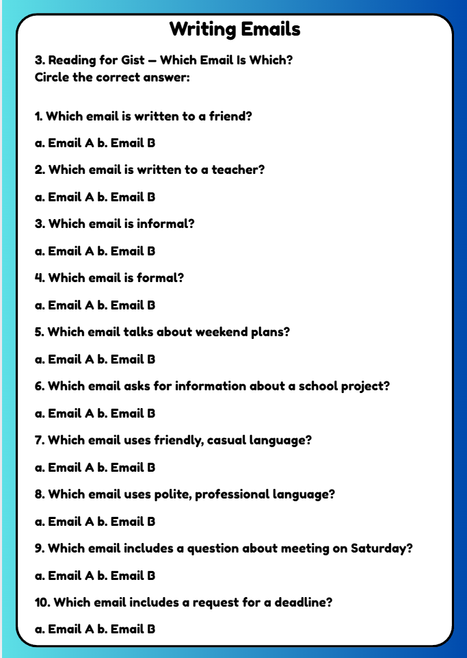 Help B1 learners (ages 10–12) master formal and informal email writing with this worksheet. Includes model emails, gist and detail questions, formal/informal phrase sorting, and guided writing tasks—perfect for building confidence in real-world communication skills.