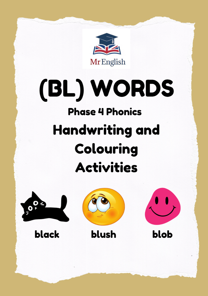 Fun and interactive BL words phonics worksheet for children aged 4–7. Includes handwriting, colouring, and sentence writing activities to practise Phase 4 phonics blends like black, blue, block, blink, and blanket. Ideal for early readers and ESL learners.
