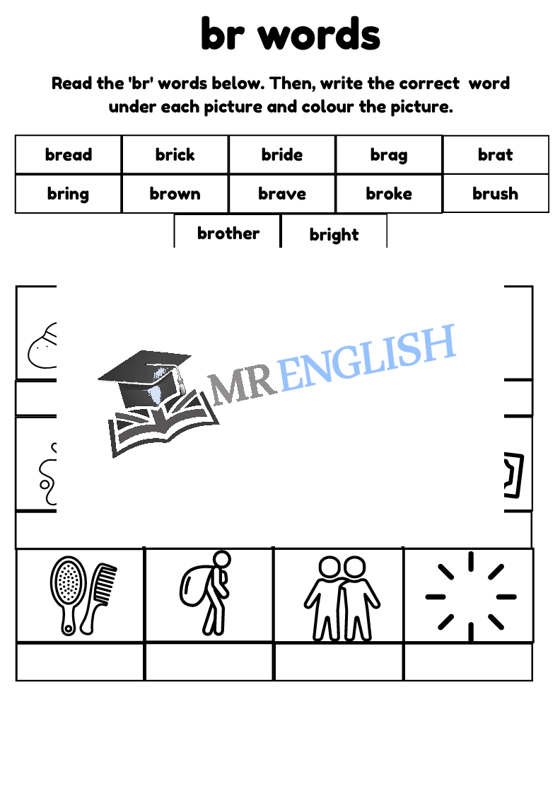 Help children aged 5-8 master BR consonant blend words with this engaging BR word worksheet! Perfect for early readers, this phonics activity improves reading, spelling, and pronunciation in a fun, interactive way. Ideal for teachers, parents, and homeschooling.