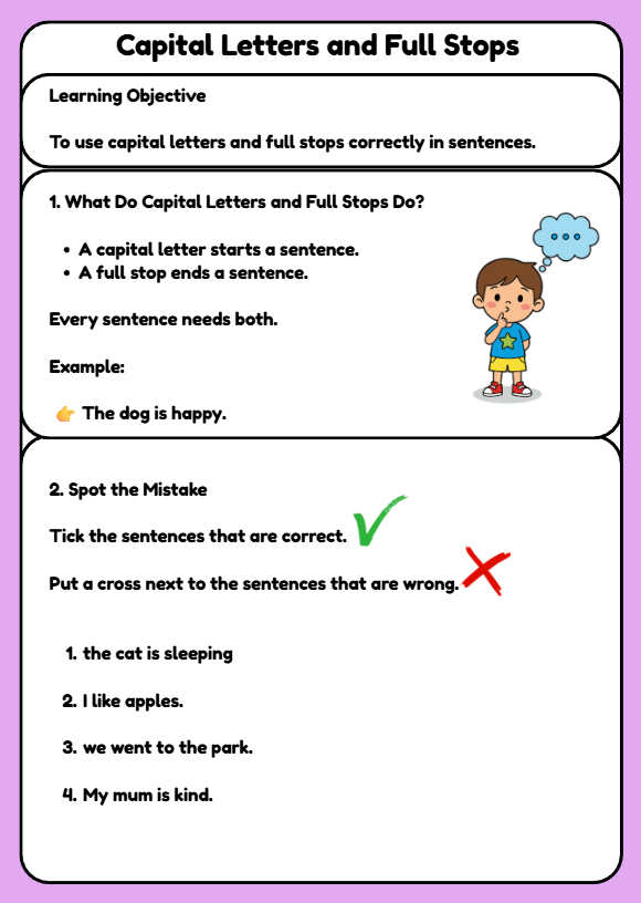 A clear and engaging Capital Letters and Full Stops worksheet for Year 1 pupils (ages 5–6). Includes spotting mistakes, fixing sentences, and writing sentences to support early grammar and writing skills.