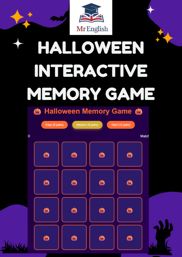 Test your memory with this fun and spooky Halloween game!Flip the cards to reveal cute Halloween illustrations and matching words β perfect for learning new vocabulary while having fun! π»Choose…