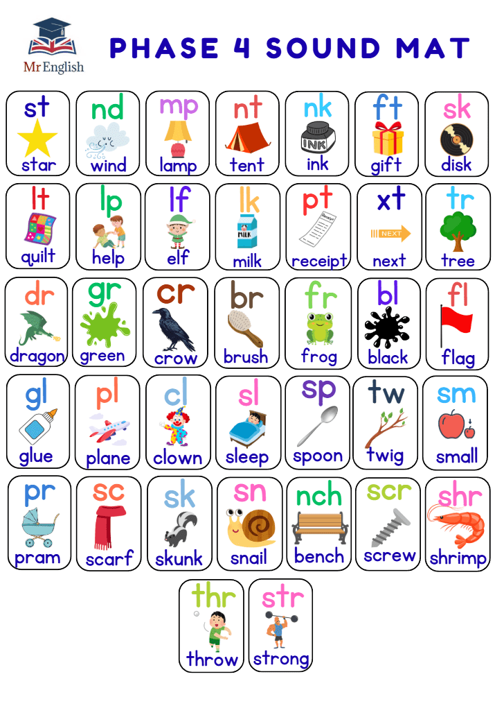 Download this colourful Phase 4 sound mat to help children master phonics blends and clusters. Perfect for early readers in Reception and Year 1.