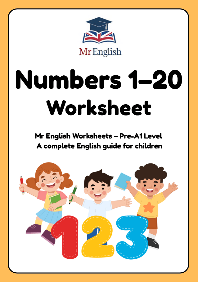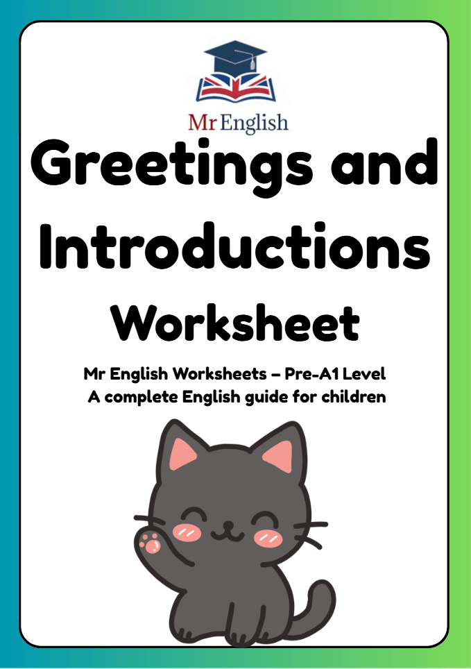Help children aged 4–7 learn common English greetings and introductions with this colourful Mr English Pre-A1 worksheet.Students practise hello, goodbye, good morning, good night, and simple introductions like My name…