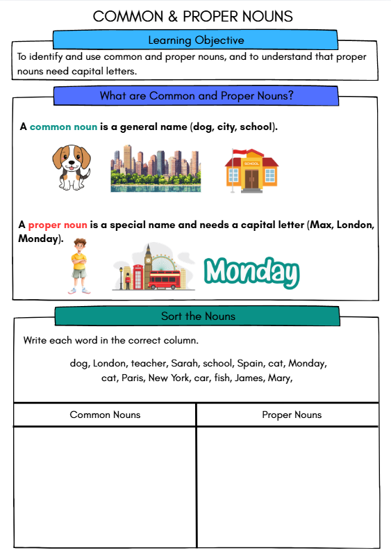 Kids in Year 2 will love the Common and Proper Nouns Worksheet as it offers a fun and engaging way to enhance their grammar skills. This interactive resource is designed specifically for Ages 6–7, making it age-appropriate and relatable. The colorful format and playful approach will capture their attention, turning grammar practice into an enjoyable activity. Students will feel accomplished as they learn to identify nouns, making it a rewarding experience!