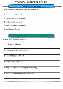 Download this Year 2 common and proper nouns worksheet for ages 6–7. Includes sorting, sentence correction, and writing tasks to help children understand capital letters and build strong grammar skills. Ideal for KS1, ESL learners, classroom use, or home learning.