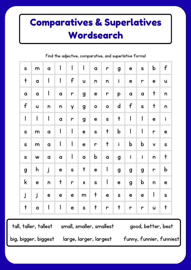 Help children master English grammar with this Comparative and Superlative Adjectives Worksheet. Perfect for ages 8–12, it includes spelling rules, examples, and fun practice exercises like fill-in-the-blank sentences and a wordsearch. Great for ESL learners and classroom use.