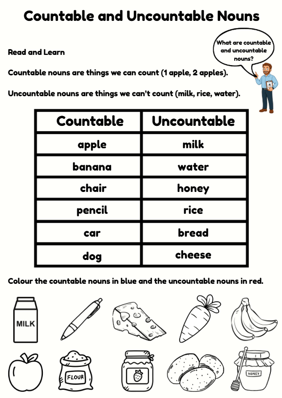 Engage your students with this fun and colourful Countable and Uncountable Nouns worksheet for children aged 7–11. Perfect for KS2 classrooms and A1–A2 ESL learners, this activity pack includes clear explanations, examples, sorting, colouring, multiple-choice grammar questions, and creative drawing tasks. Great for teaching a, an, some, many, and much in a simple, visual way. Ideal for ESL teachers, homeschooling parents, or online English lessons — download and print today for interactive grammar fun!
