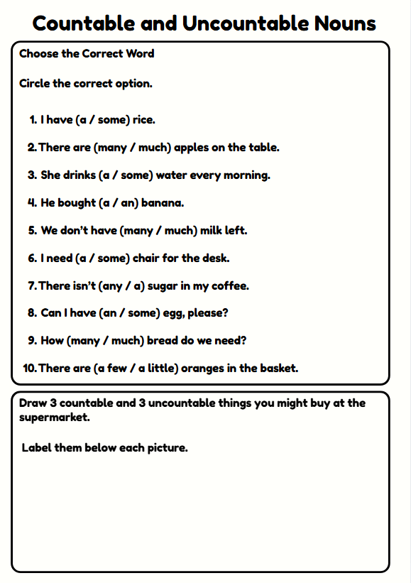 Engage your students with this fun and colourful Countable and Uncountable Nouns worksheet for children aged 7–11. Perfect for KS2 classrooms and A1–A2 ESL learners, this activity pack includes clear explanations, examples, sorting, colouring, multiple-choice grammar questions, and creative drawing tasks. Great for teaching a, an, some, many, and much in a simple, visual way. Ideal for ESL teachers, homeschooling parents, or online English lessons — download and print today for interactive grammar fun!