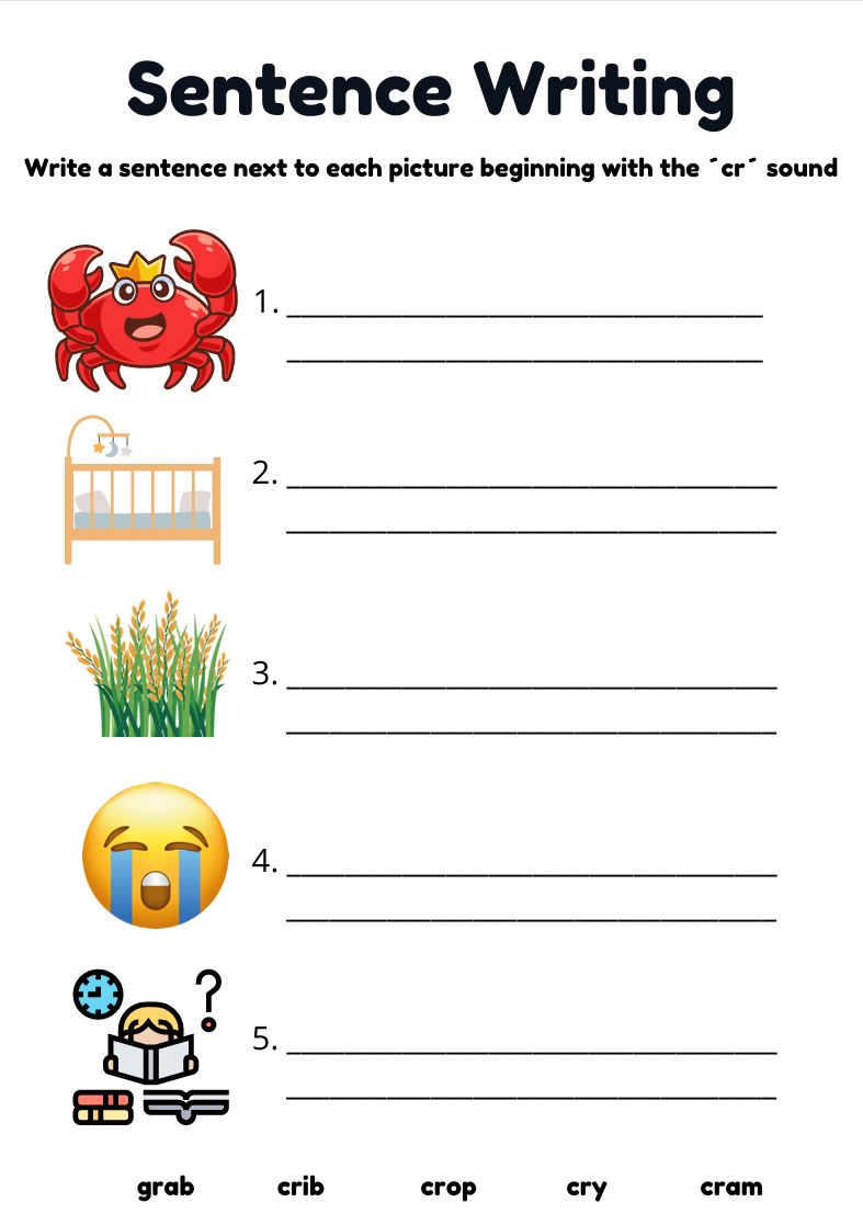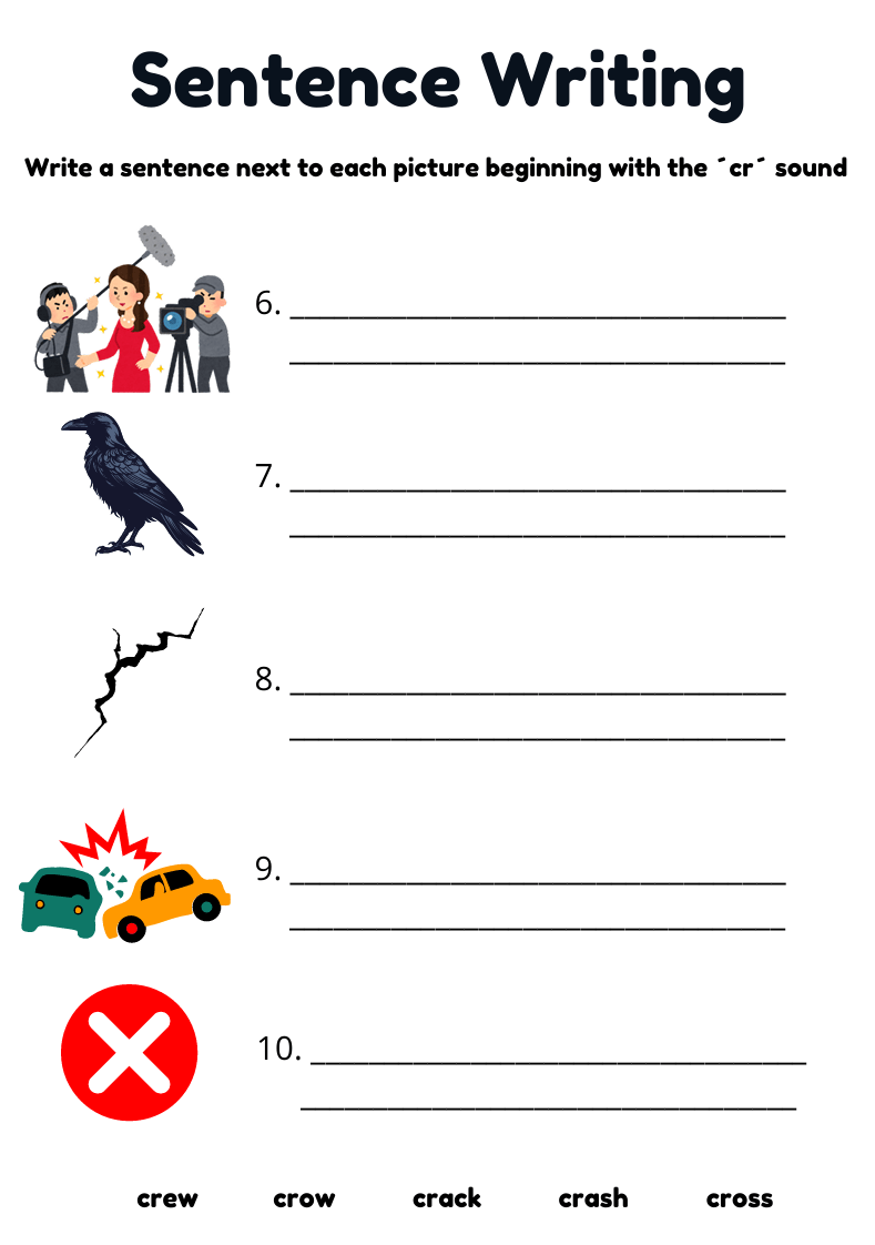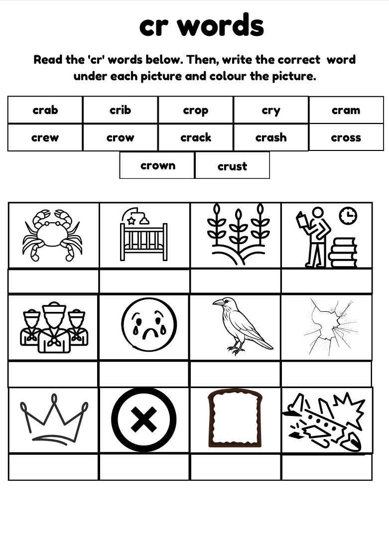Help children aged 5-8 master CR consonant blend words with this engaging CR word worksheet! Perfect for early readers, this phonics activity improves reading, spelling, and pronunciation in a fun, interactive way. Ideal for teachers, parents, and homeschooling.