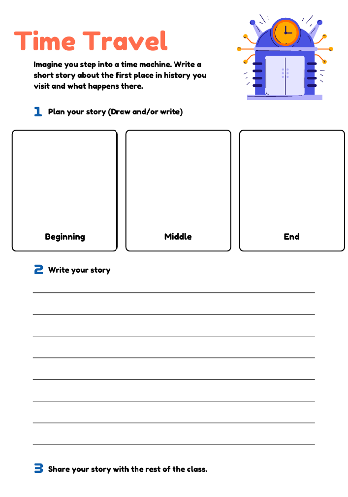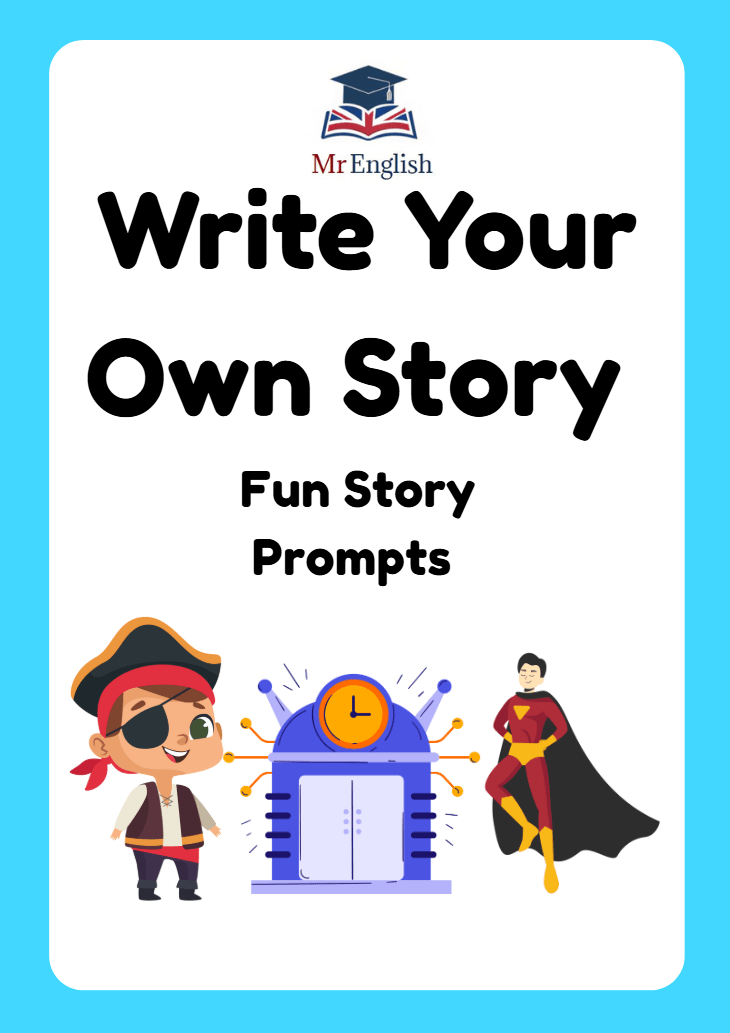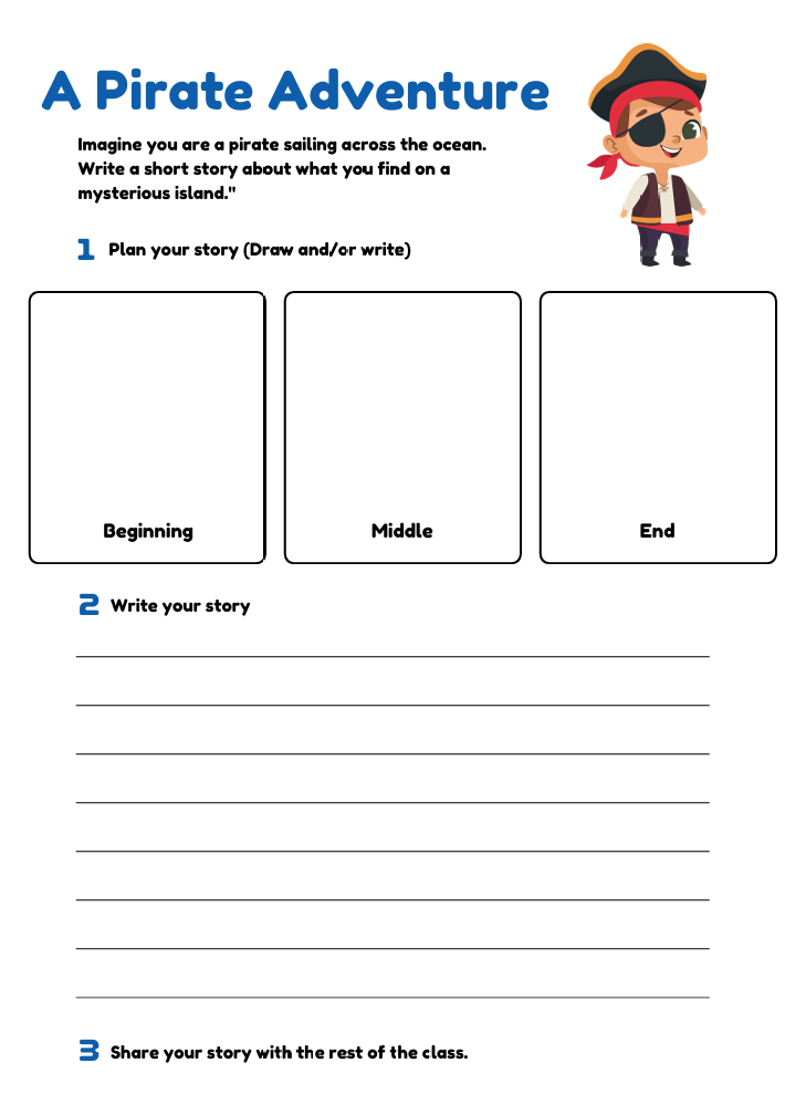 Fun story writing worksheet for children ages 7–12. Includes exciting prompts like pirates, time travel, magic doors, superpowers, and talking animals.