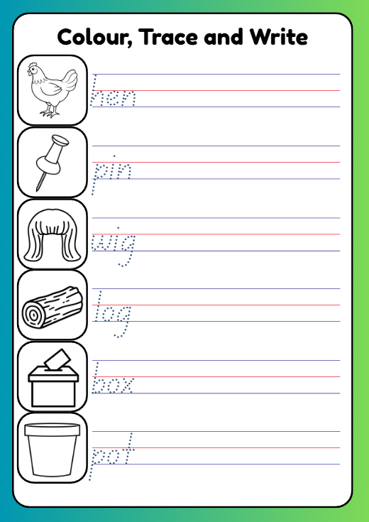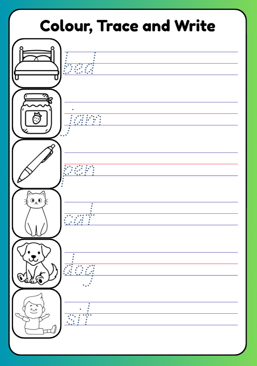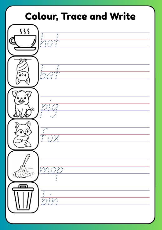 This printable pack helps early readers practise phonics, handwriting and word recognition through colouring, tracing and writing simple CVC words. Ideal for preschool, kindergarten, ESL learners and early phonics practice.