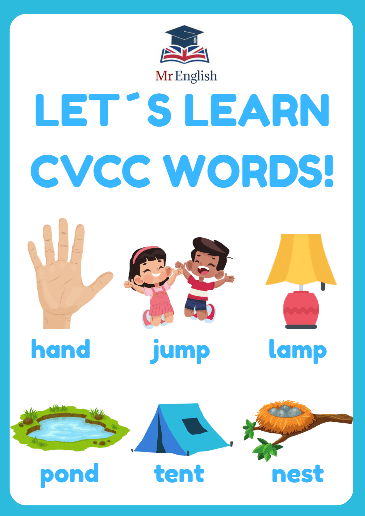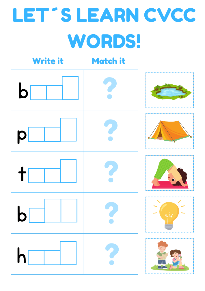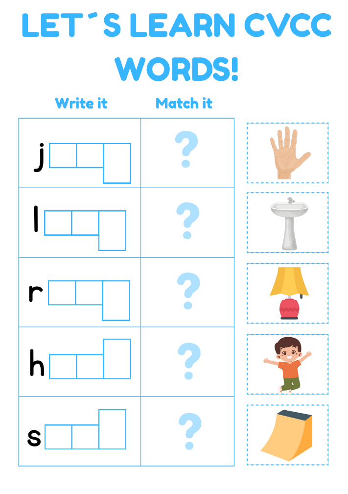 Fun CVCC phonics worksheet for kids aged 5–7! Practice reading, writing, and matching consonant-vowel-consonant-consonant words like hand, nest, and lamp.