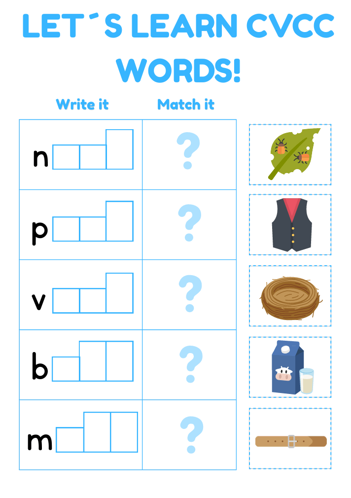 Fun CVCC phonics worksheet for kids aged 5–7! Practice reading, writing, and matching consonant-vowel-consonant-consonant words like hand, nest, and lamp.