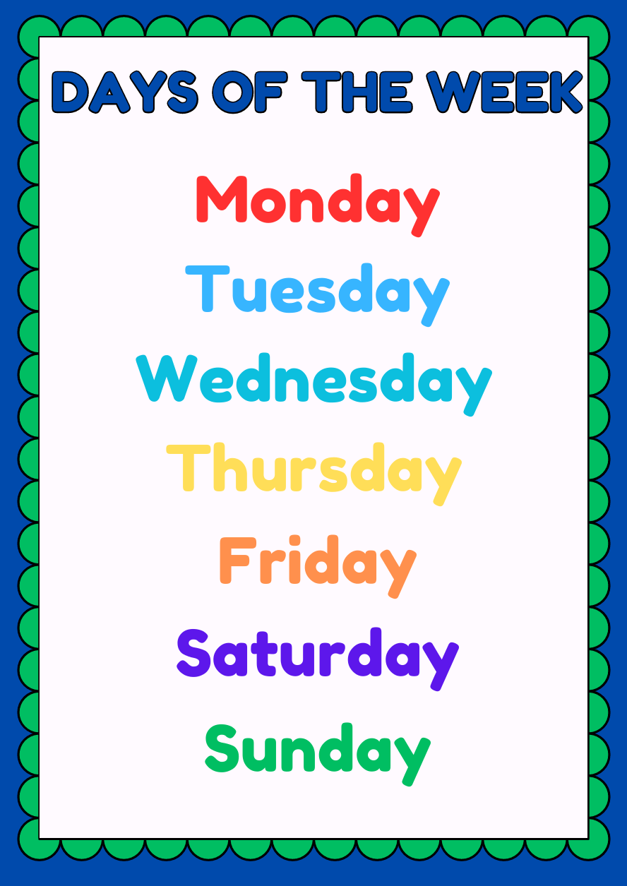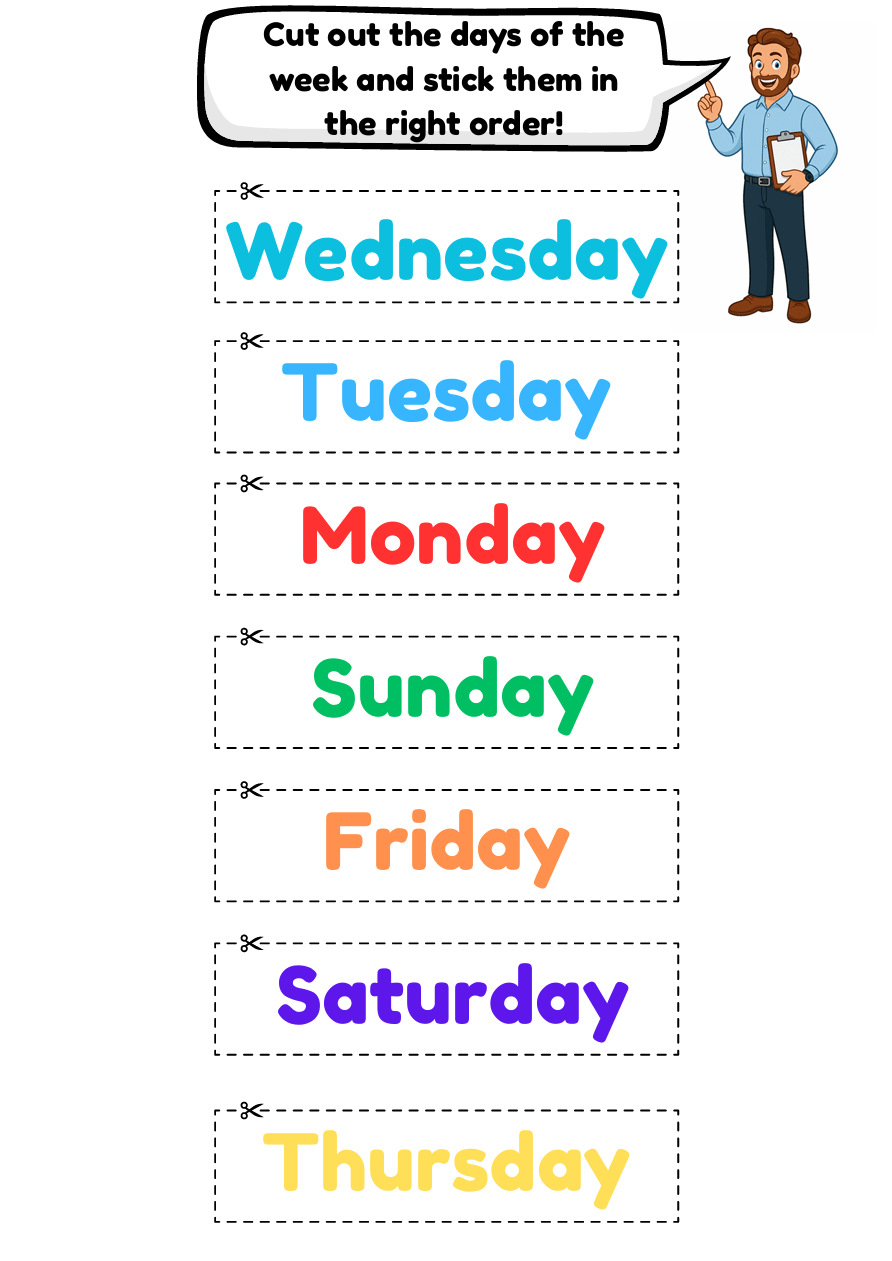 This fun and interactive worksheet helps children learn the days of the week through cutting, ordering, tracing, and writing activities. Kids can cut out the days, put them in the correct order, practise tracing each word, and then write them on their own. Perfect for early learners and ESL students to build vocabulary, spelling, and handwriting skills!