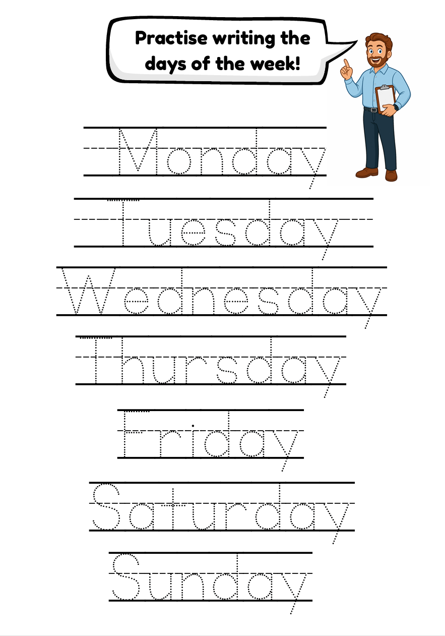 This fun and interactive worksheet helps children learn the days of the week through cutting, ordering, tracing, and writing activities. Kids can cut out the days, put them in the correct order, practise tracing each word, and then write them on their own. Perfect for early learners and ESL students to build vocabulary, spelling, and handwriting skills!