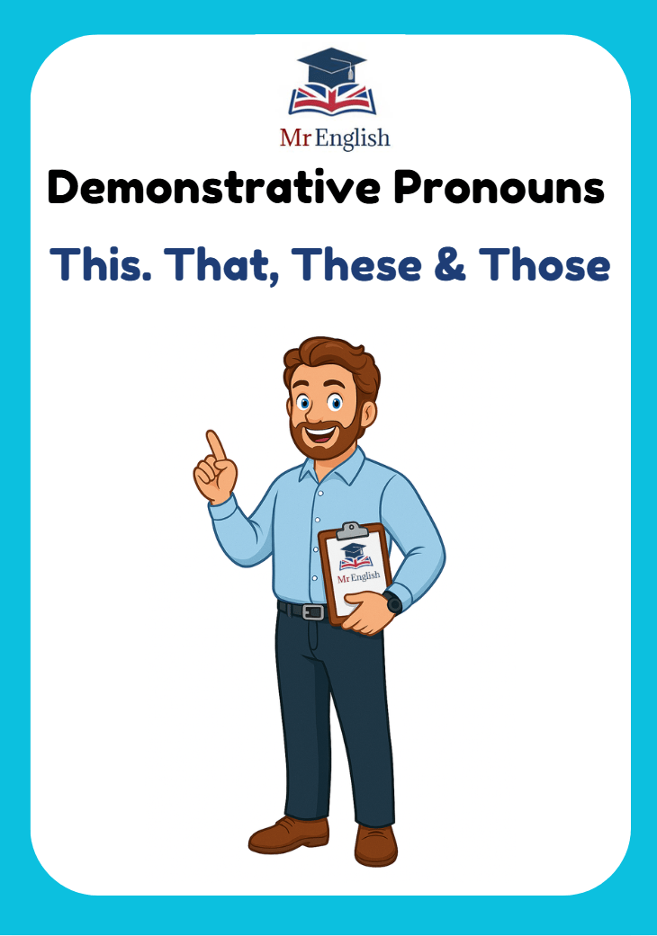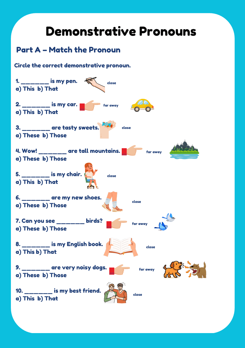 Engaging printable worksheet to help children master demonstrative pronouns: this, that, these, and those. Ideal for ESL learners and primary students aged 6–9. Available for download at Mr English.