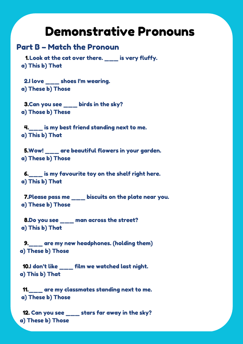 Kids aged 6–9 will love the Demonstrative Pronouns Worksheet focusing on This, That, These, and Those! Engaging and interactive, this worksheet makes learning fun and helps them grasp essential language concepts. With colorful illustrations and relatable examples, children will enjoy exploring pronouns in a playful way, making their learning experience both enjoyable and memorable!