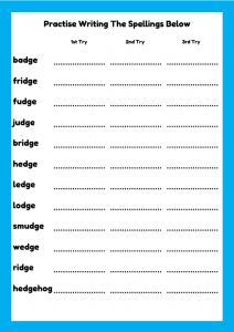 A Phase 6 phonics worksheet focusing on DGE words such as badge, fridge, bridge, and hedge. Includes spelling practice, sentence writing, clues, and a word search for children aged 7–9.