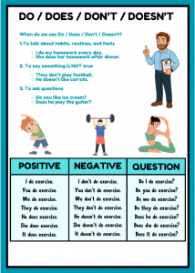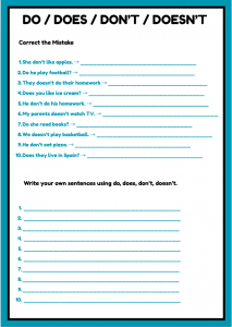 Printable worksheet for children aged 8–12 to practise “do, does, don’t, doesn’t” in the present simple tense. Includes clear explanations, fill-in-the-blank exercises, mistake correction, and writing tasks to help kids master English grammar.