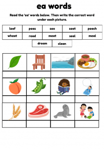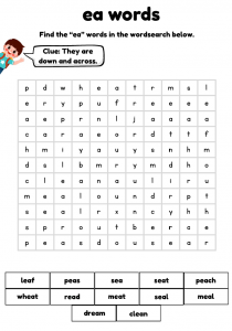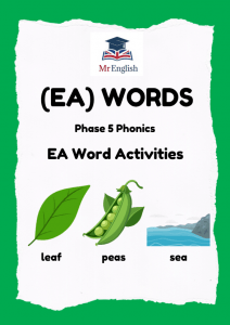 Engaging EA phonics worksheets for children ages 6–8. Packed with wordsearches, clues, and sentence writing to practise Phase 5 “EA” words like sea, peach, meat, and dream. Perfect for ESL learners and early readers.