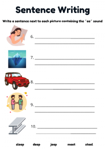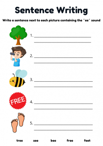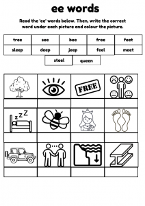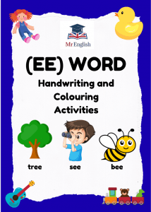 Engaging EE words phonics worksheet designed for children aged 5–7. Includes reading, handwriting, and colouring activities to help kids learn and practise ‘ee’ sound words like tree, bee, see, feet, and more. Perfect for early literacy and phonics learning at home or in the classroom.