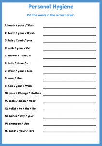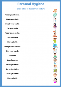 Engaging ESL personal hygiene worksheet and colourful poster for kids ages 5–10. Features 15 essential hygiene sentences with matching, jumbled word, and writing activities. Ideal for teachers and parents supporting young English learners.