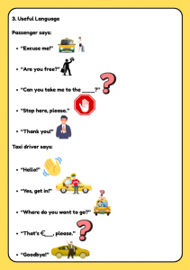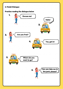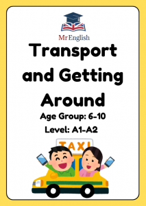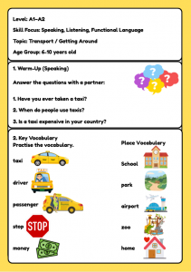 Fun ESL taxi role play worksheet for kids aged 6–10. Includes transport vocabulary, gap-fill sentences, model dialogue, and speaking activities. Perfect for A1–A2 young learners.